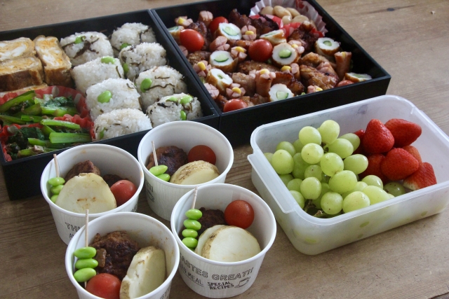 • フルーツ串:イチゴやブドウ、メロンなどのフルーツを一口サイズにカットし、串に刺すことで、見た目が華やかになります。デザート代わりにもなるので、お弁当の隙間を埋めるのに最適です。